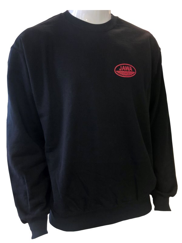 Černá bavlněná mikina v klasickém střihu a s kulatým průkrčníkem. Průkrčník, manžety a lem z žebrovaného materiálu 1x1. Zesílené kryté švy průkrčníku. Vyrobené ze 100% bavlny. Logo 7 cm vpředu, velké logo v zadu s adresou www.jawavysocina.cz.